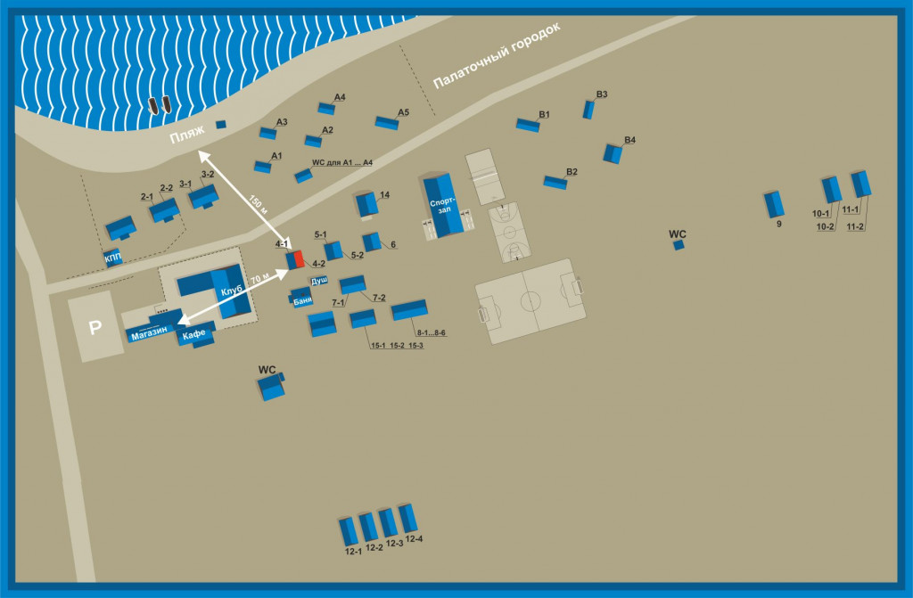 6 местный домик в центральной части базы, 150 м до берега. Близость всей инфраструктуры.
