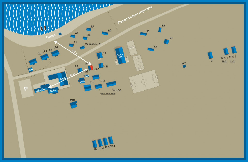 6 местный домик в центральной части базы, 150 м до берега. Близость всей инфраструктуры.
