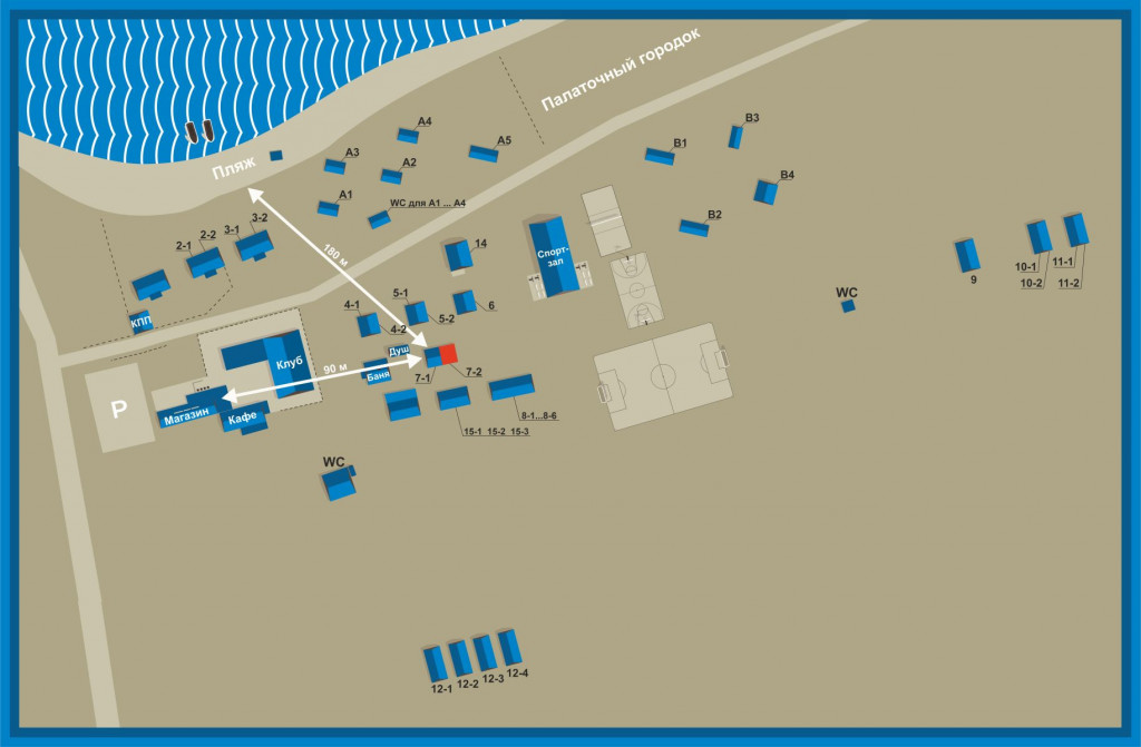 8 местный домик в центральной части базы, 180 м до берега. Близость всей инфраструктуры.