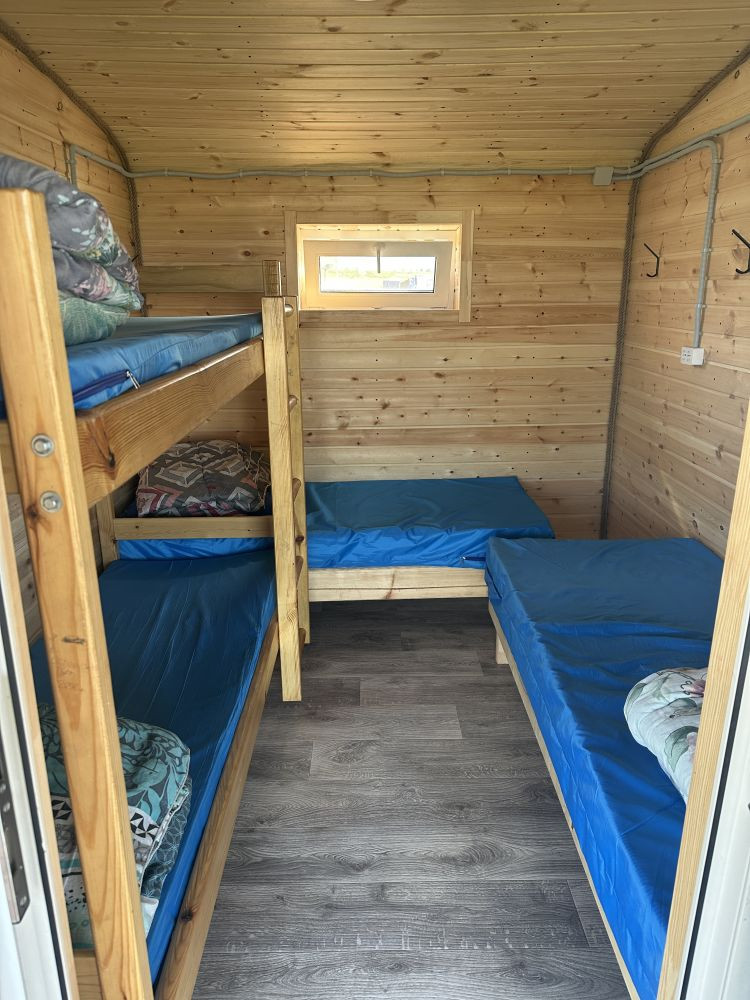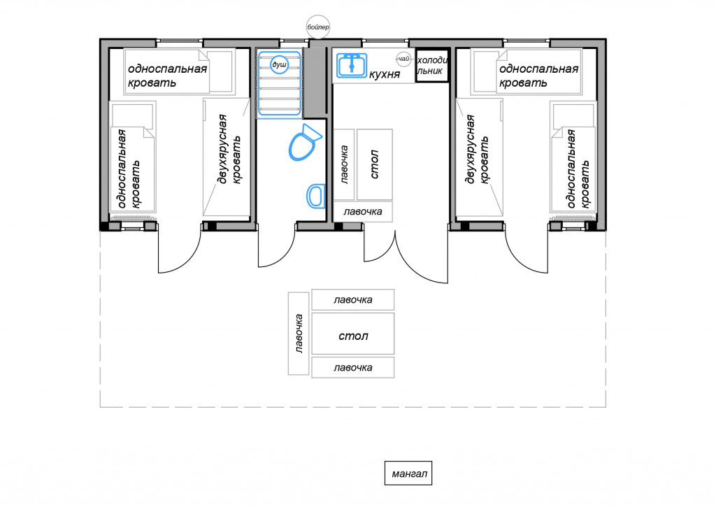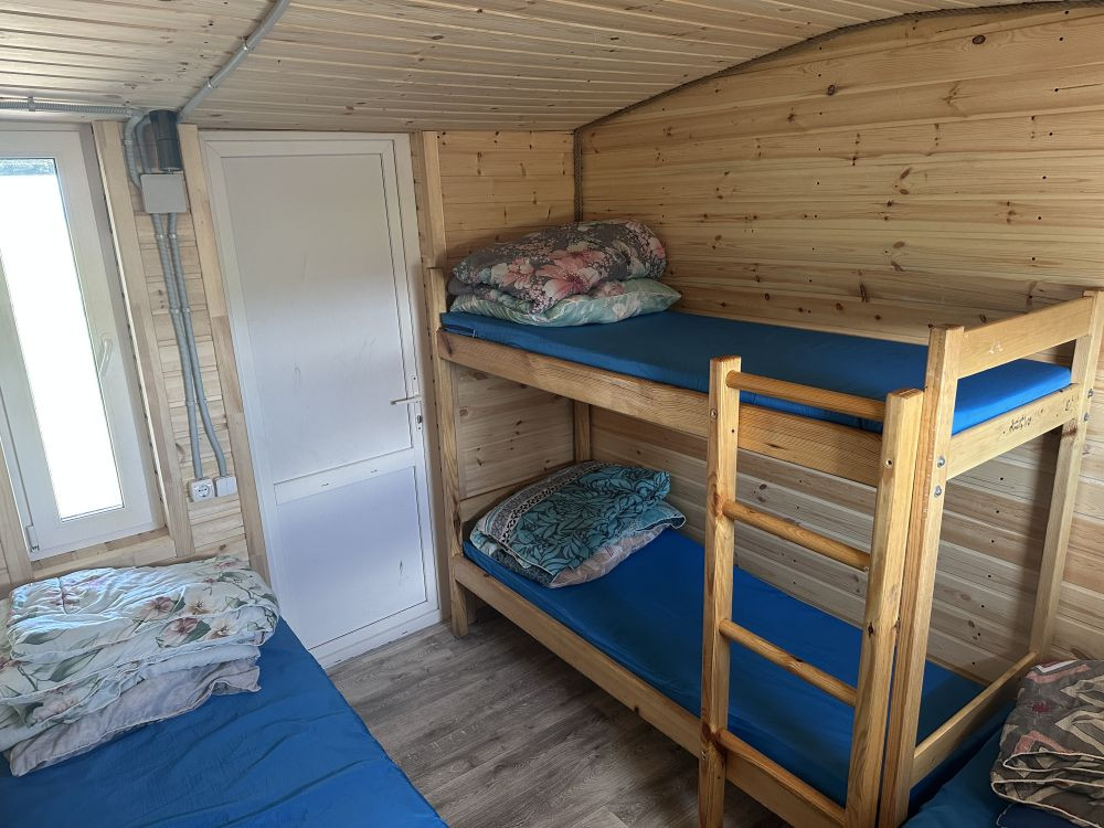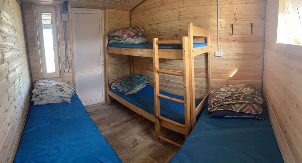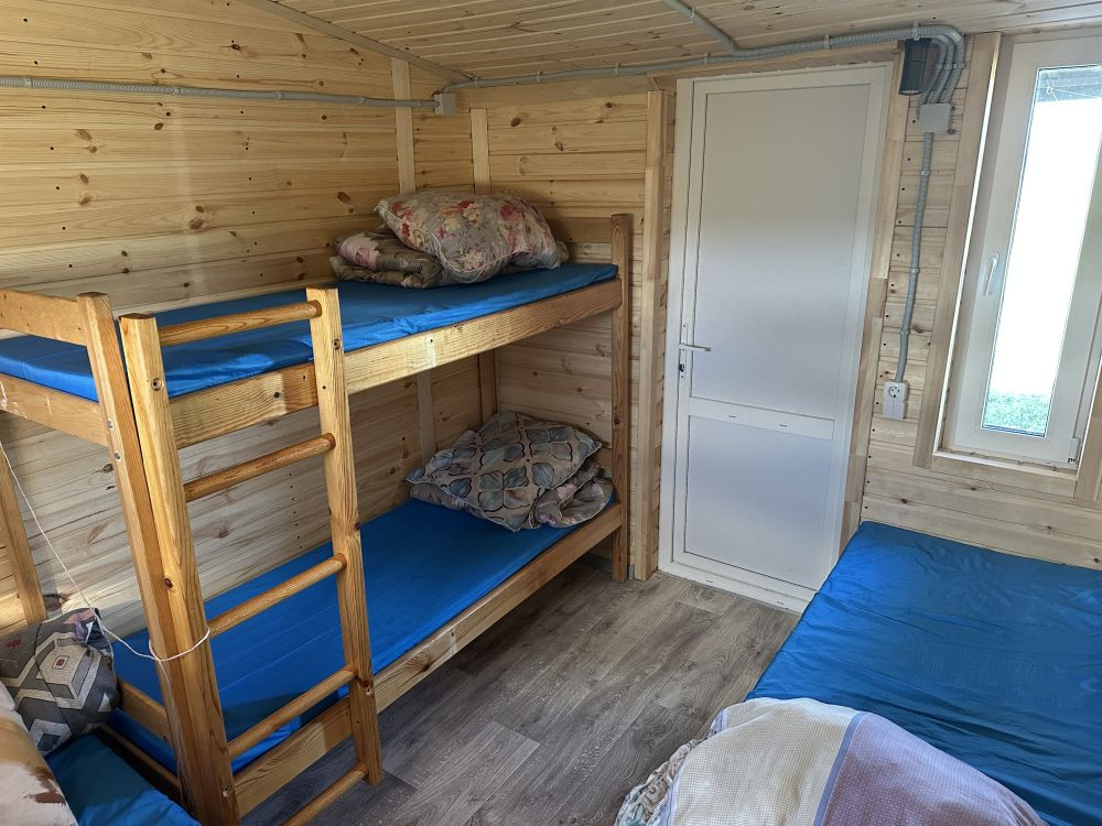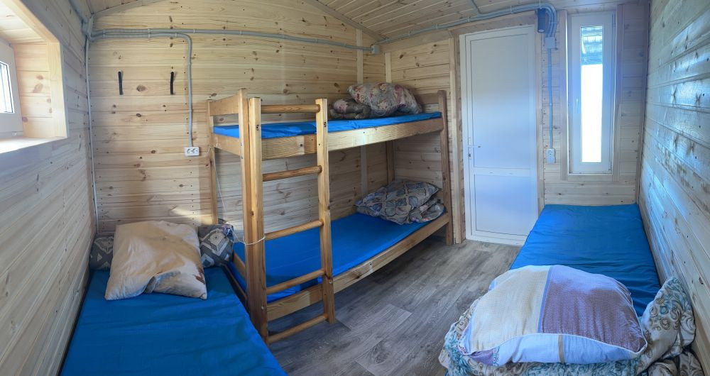 2 спальные комнаты общей площадью 14 кв.м. В каждой комнате 2 односпальные кровати и 1 двухъярусная кровать. Собственная кухня-веранда площадью 6 кв.м. Крытый навес перед домиком площадью 24 кв.м.
