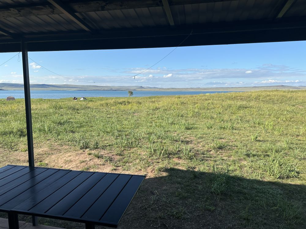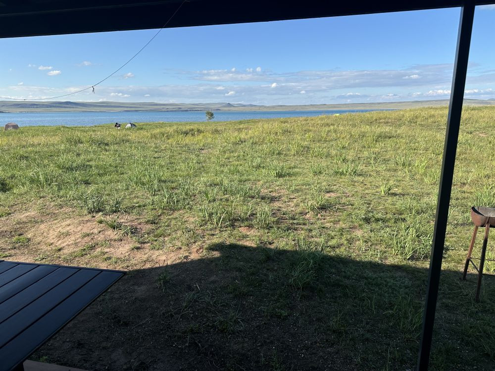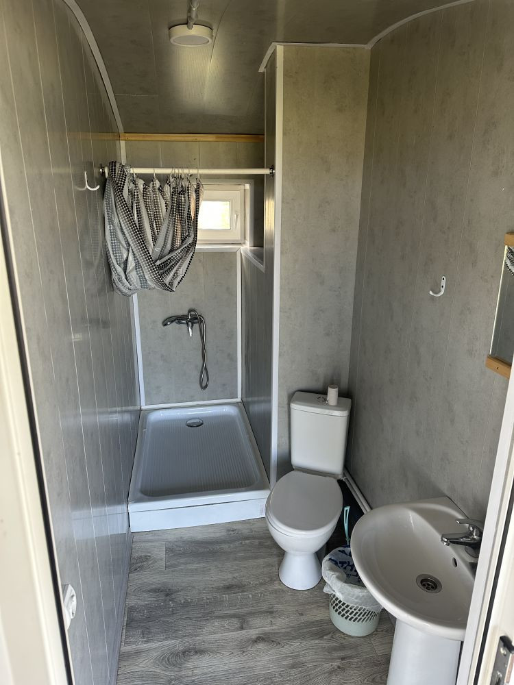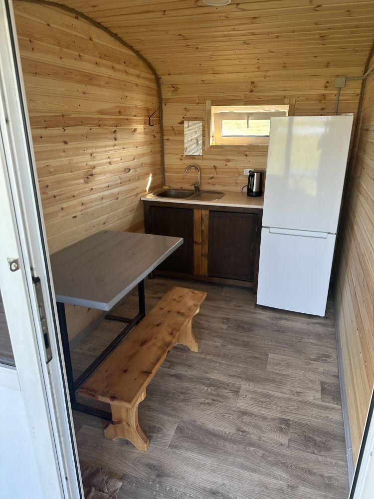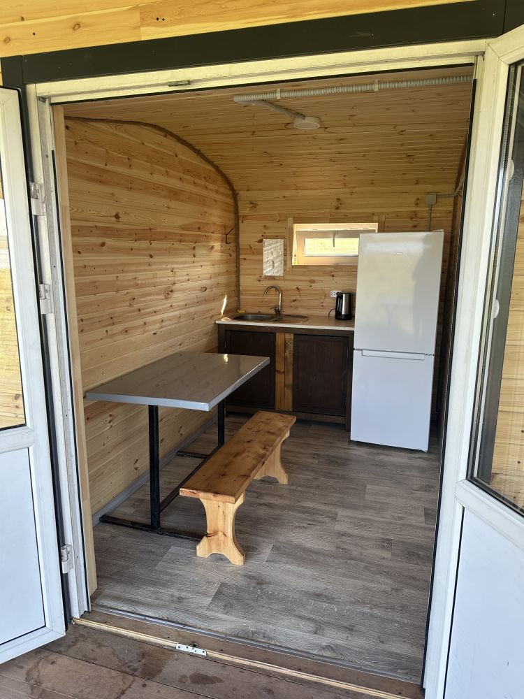 В домике - электричество, холодильник, чайник, собственный туалет и горячий душ. Перед домиком смонтирована деревянная площадка и навес. Рядом установлен мангал.