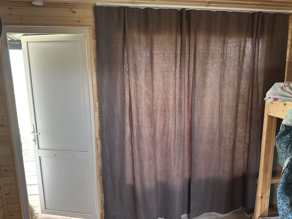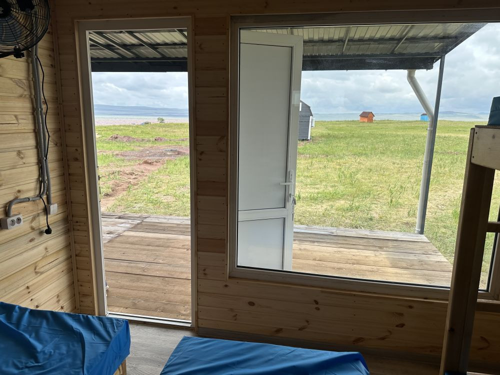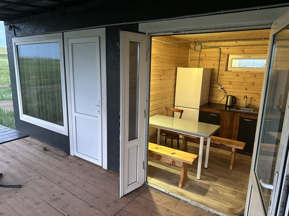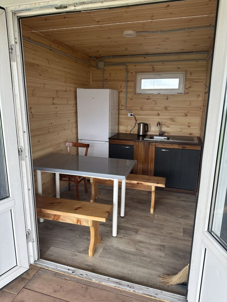 В домике - электричество, холодильник, чайник, собственный туалет и горячий душ. Перед домиком смонтирована деревянная площадка и навес. Рядом установлен мангал.