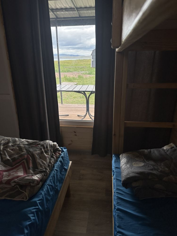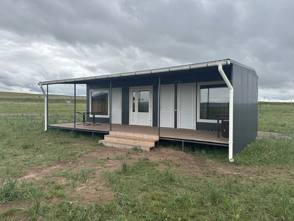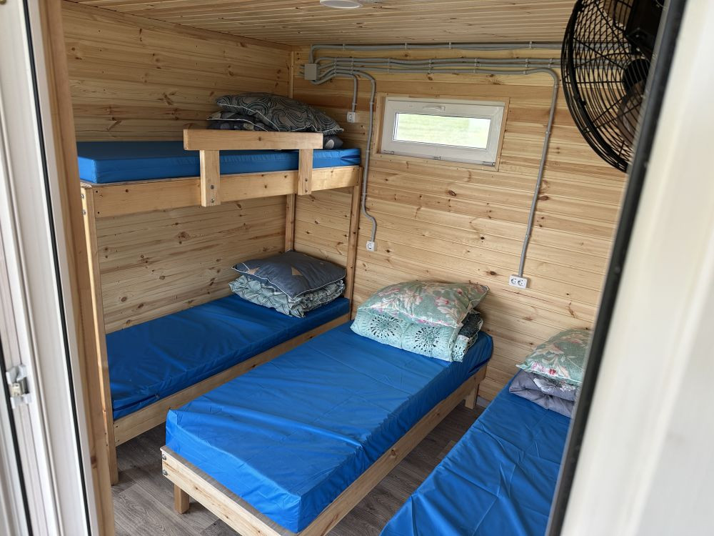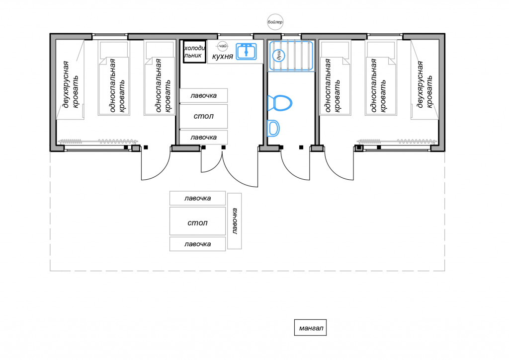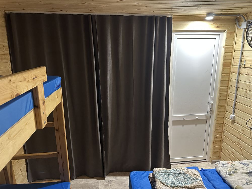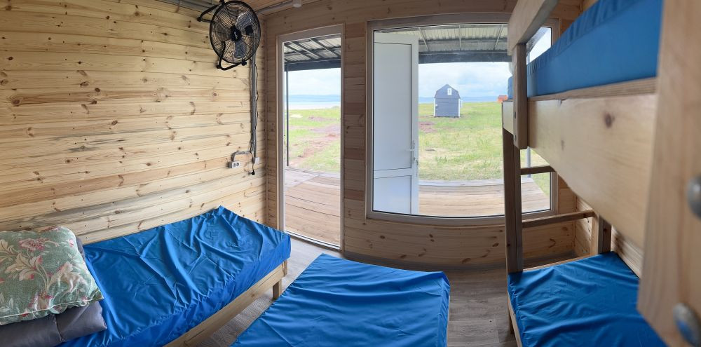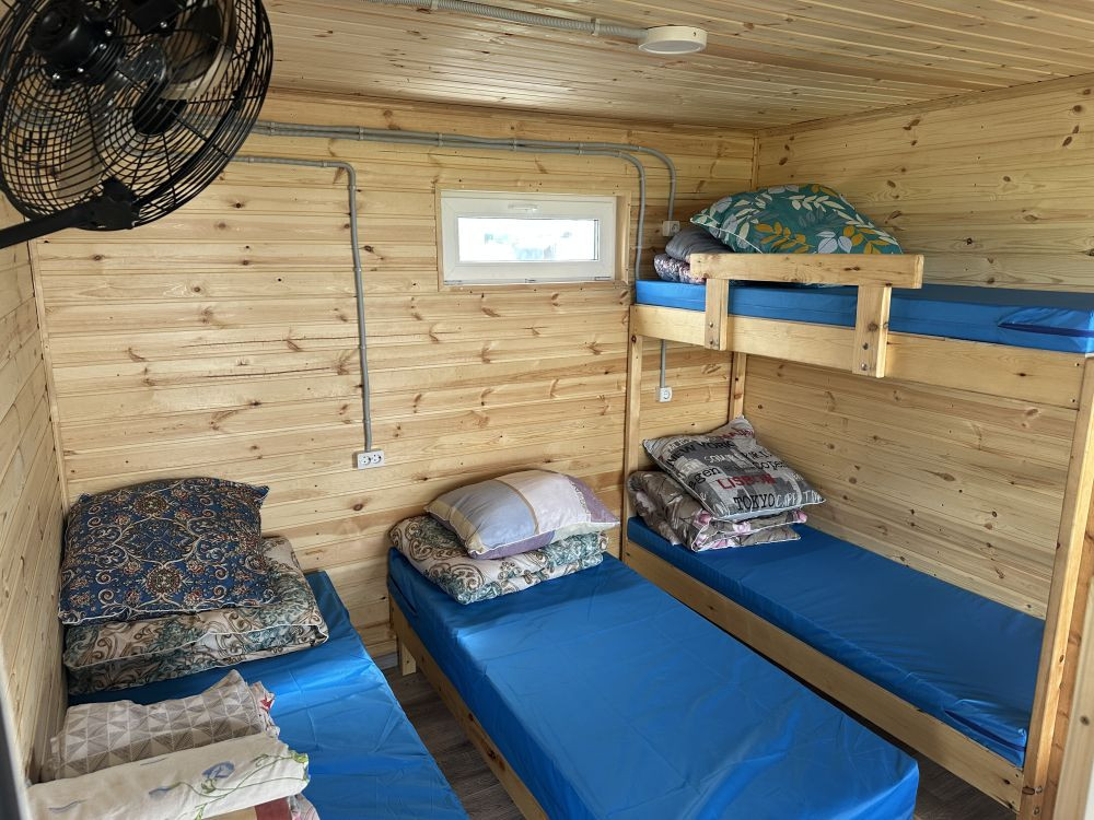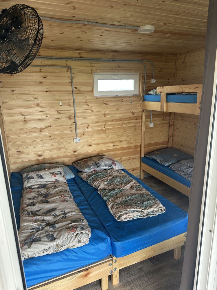 2 спальные комнаты общей площадью 16 кв.м. В каждой комнате 2 односпальные кровати, конструкция которых позволяет превратить их в 1 двуспальную кровать, а также 1 двухъярусная кровать. Собственная кухня-веранда площадью 5,5 кв.м. Крытый навес перед домиком площадью 30 кв.м.