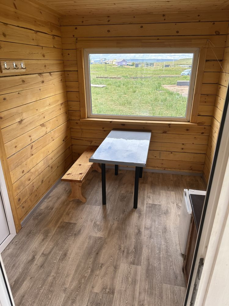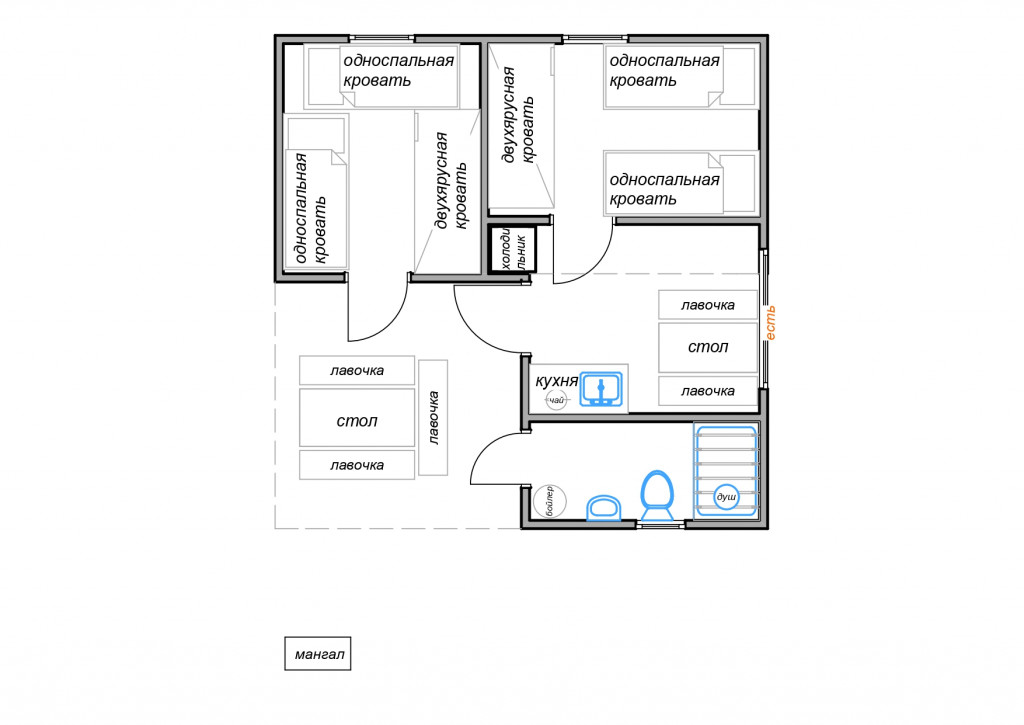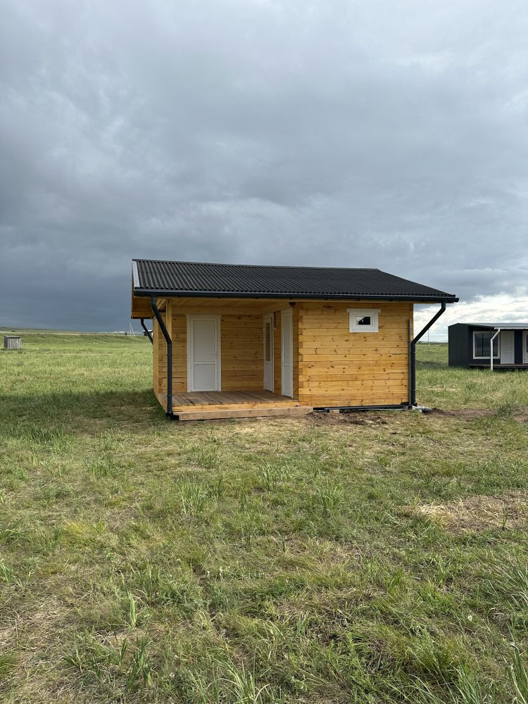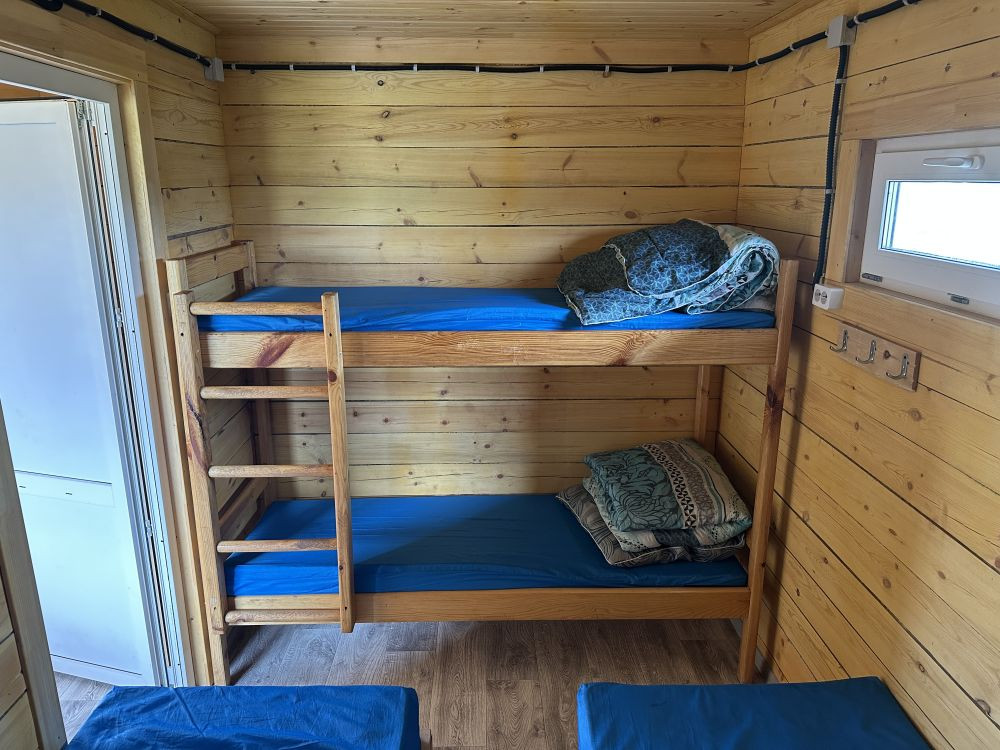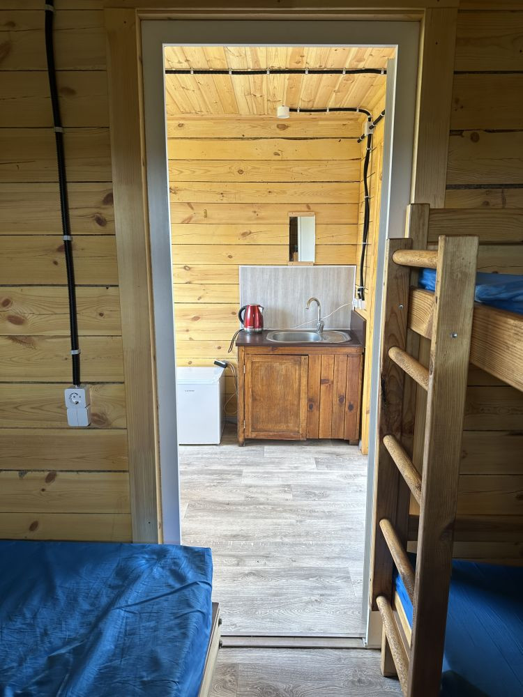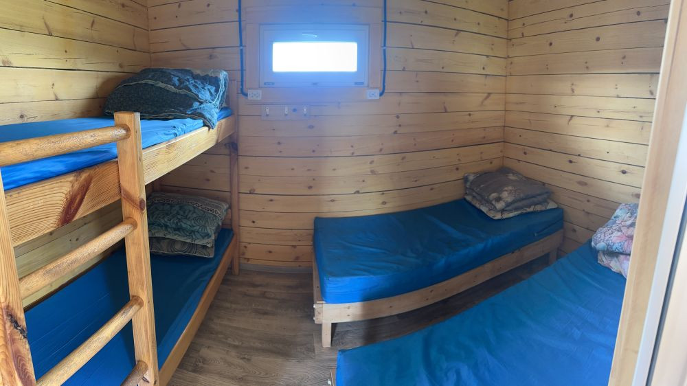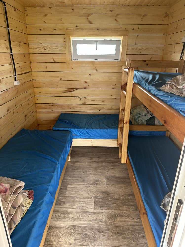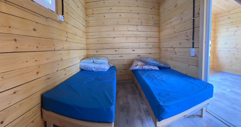 2 спальные комнаты общей площадью 13 кв.м. В первой комнате 2 односпальные кровати и 1 двухъярусная кровать. Во второй комнате 2 односпальные кровати, конструкция которых позволяет превратить их в 1 двуспальную кровать, а также 1 двухъярусная кровать. Собственная кухня площадью 6,5 кв.м. Крытый навес перед домиком площадью 9 кв.м.