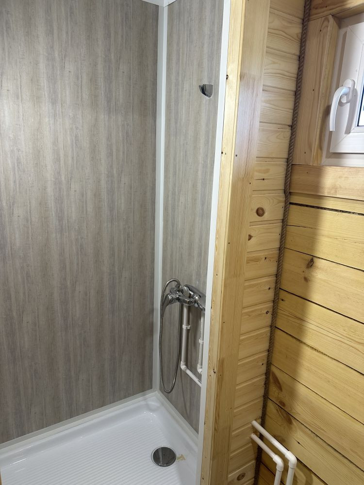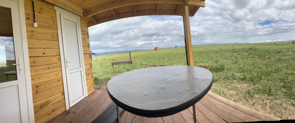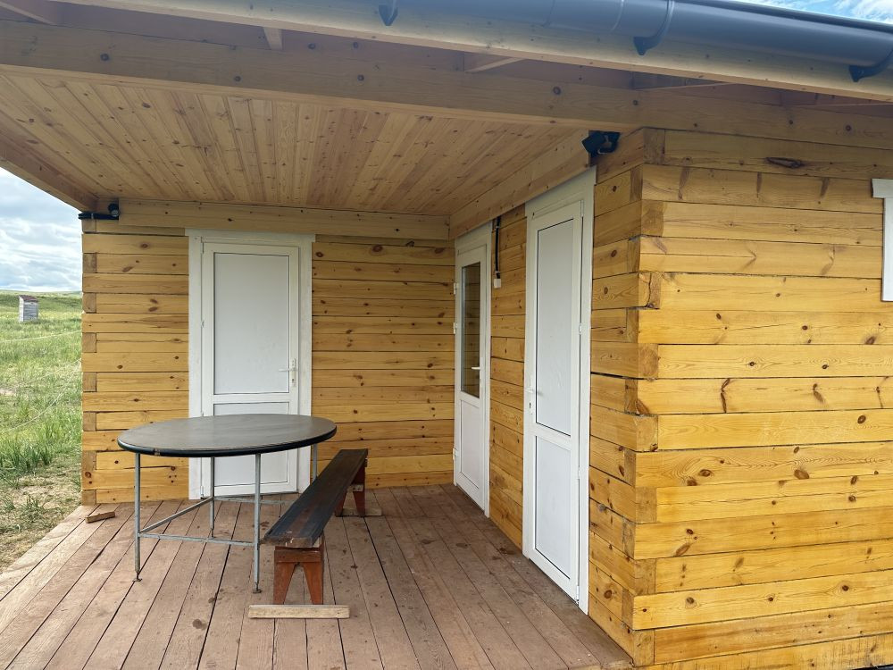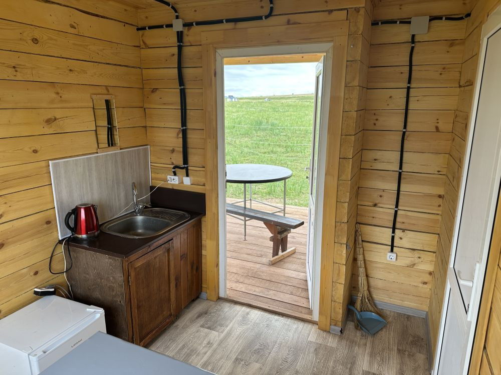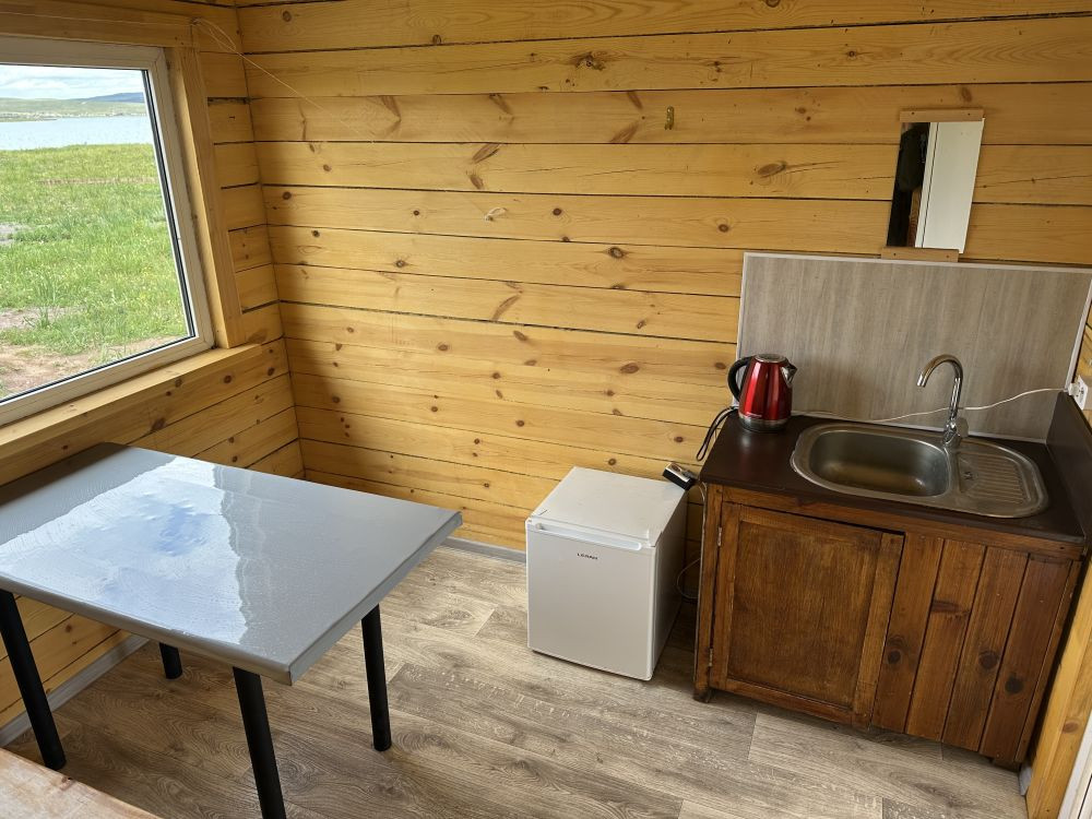 В домике - электричество, холодильник, чайник, собственный туалет и горячий душ. Перед домиком смонтирована деревянная площадка и навес. Рядом установлен мангал.