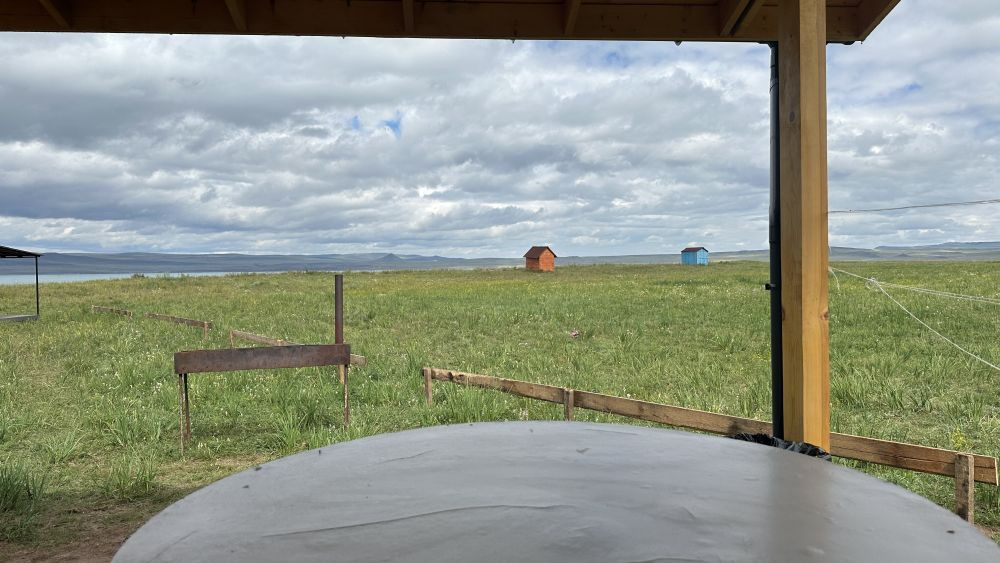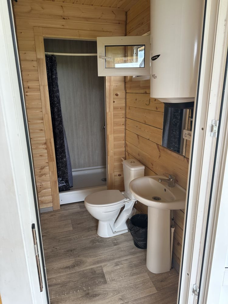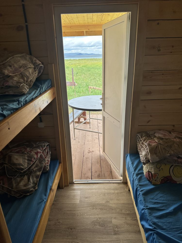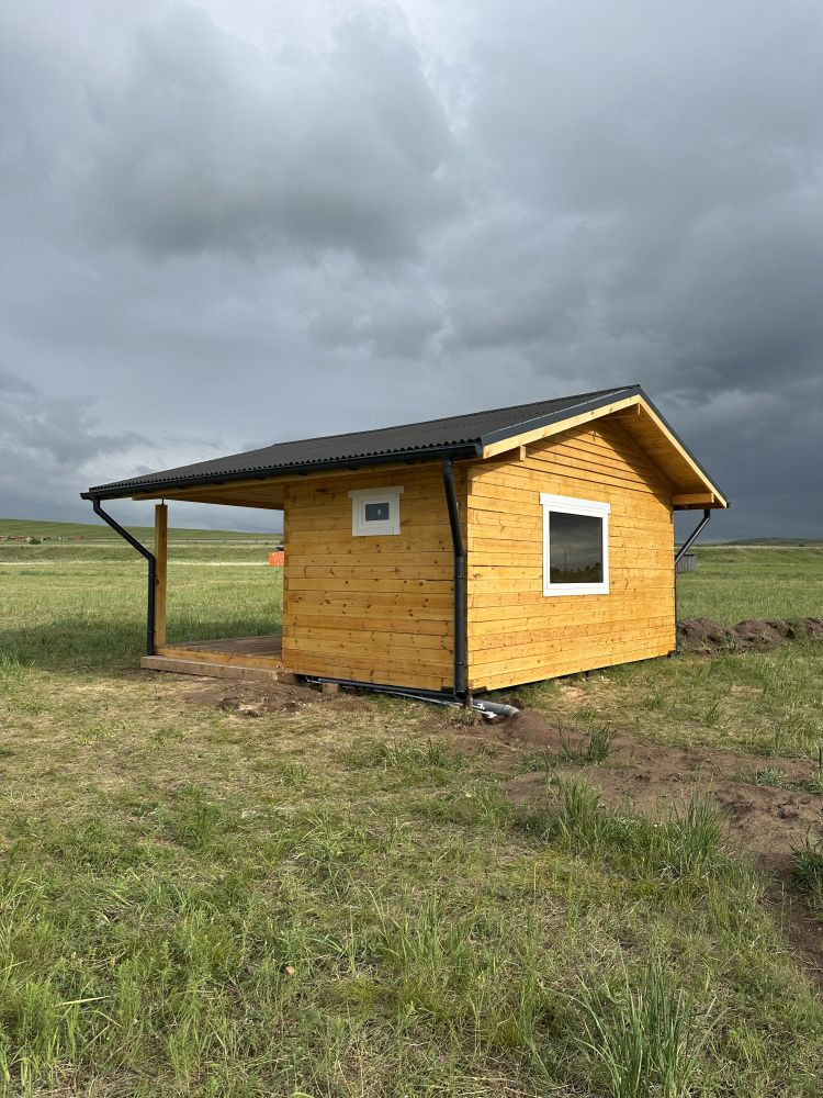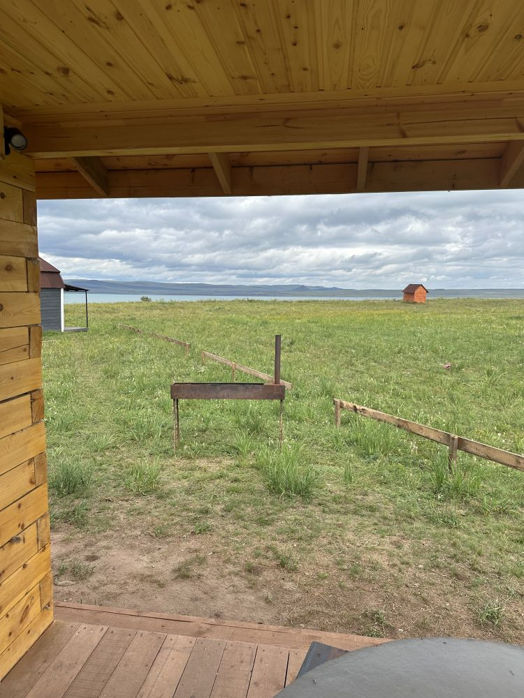 В домике - электричество, холодильник, чайник, собственный туалет и горячий душ. Перед домиком смонтирована деревянная площадка и навес. Рядом установлен мангал.